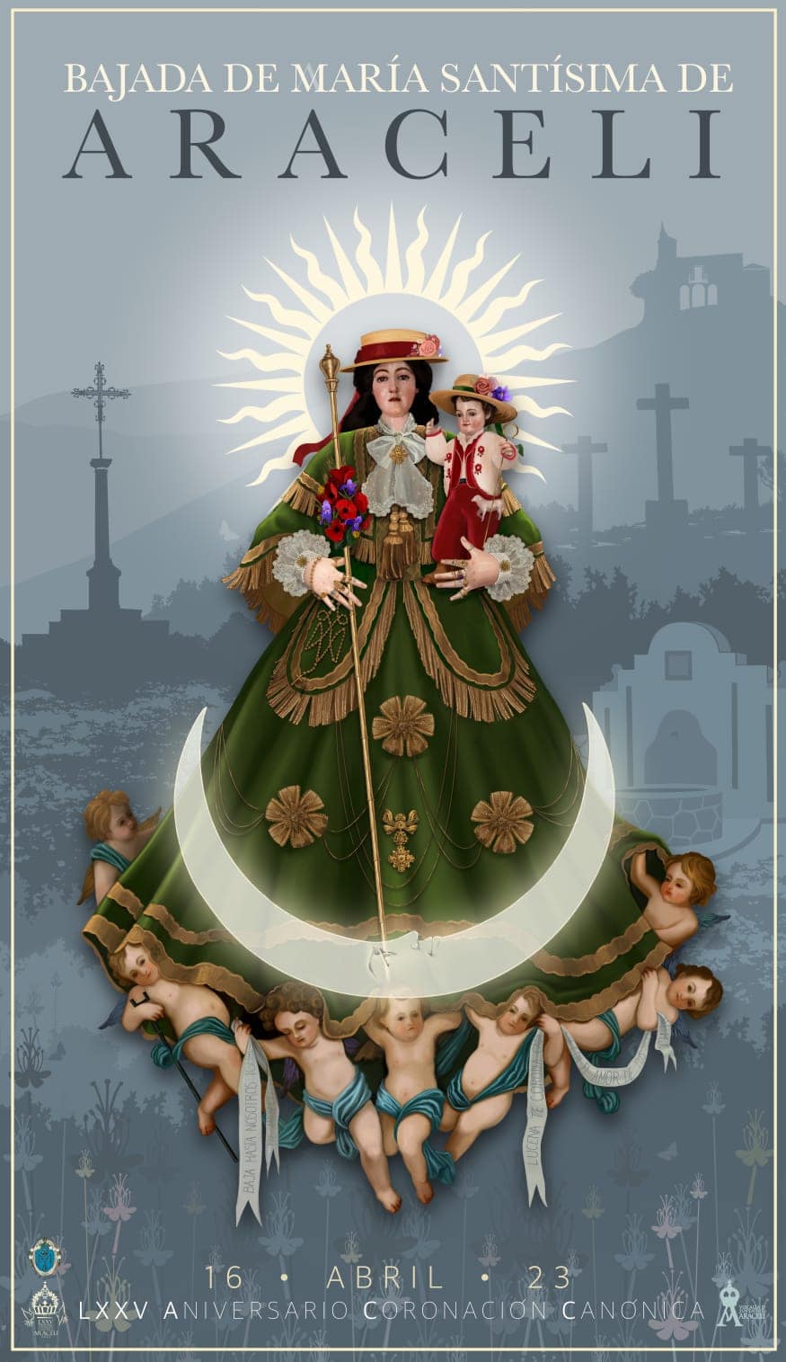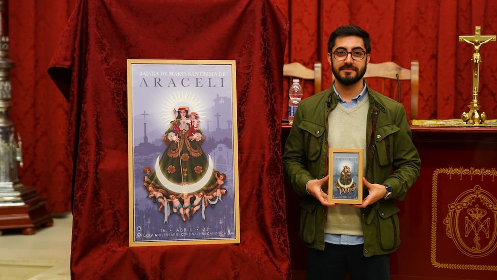 El cartel de la Bajada de María Santísima de Araceli para 2023 elaborado por Manuel Espejo Mármol muestra la imagen de la Patrona de Lucena vestida de camino y a hombros de ángeles santeros que la guían hasta Lucena.